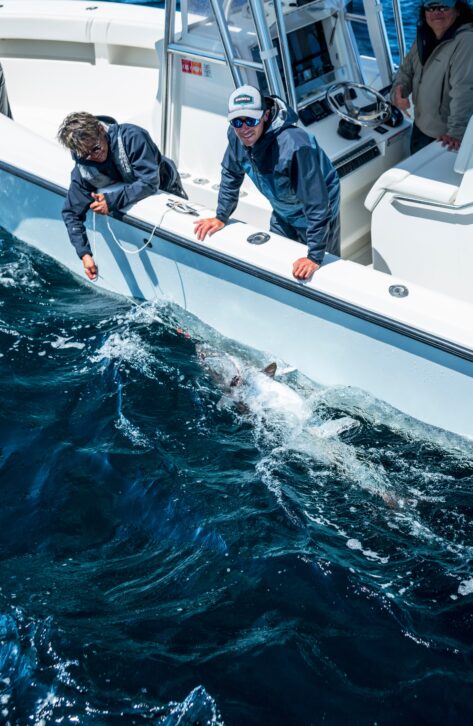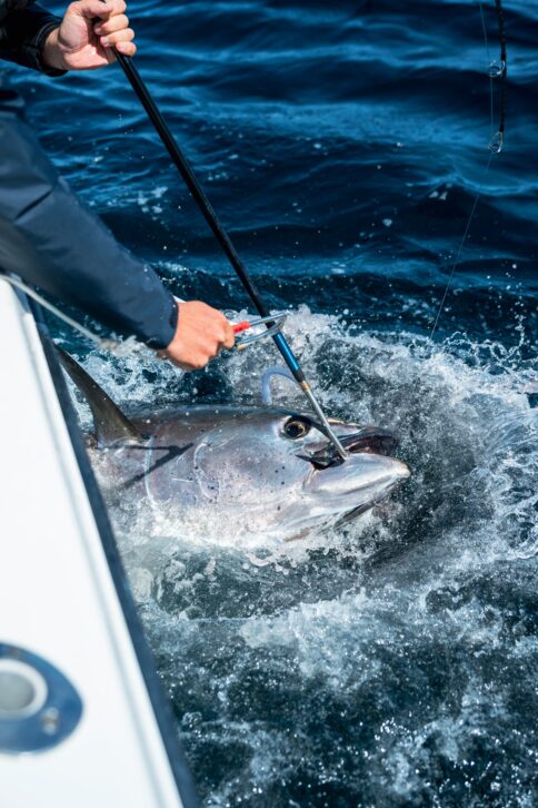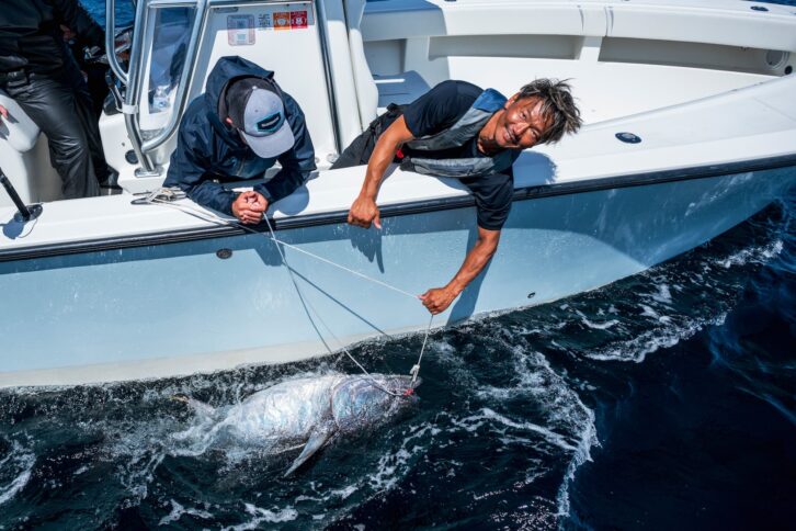 最後は浮かせ、何回か空気を吸わせると大人しくなる。そうなったら、船長やクルーなどにリーダーを取ってもらいランディング。リリースの場合、素早くルアーを外し、船で引っ張り蘇生させる。写真は2025年ボストンにて。写真提供:シマノ