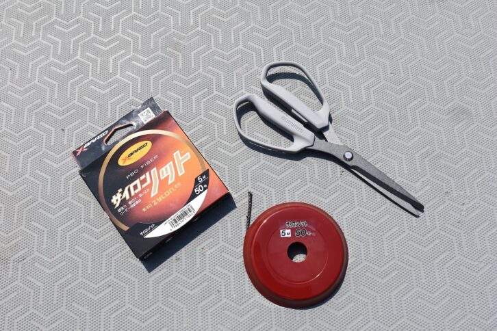 ザイロンノットを結束する長さより倍ほどの長さで切り、芯を抜く。強いザイロンノットを綺麗に切れるハサミが必要。