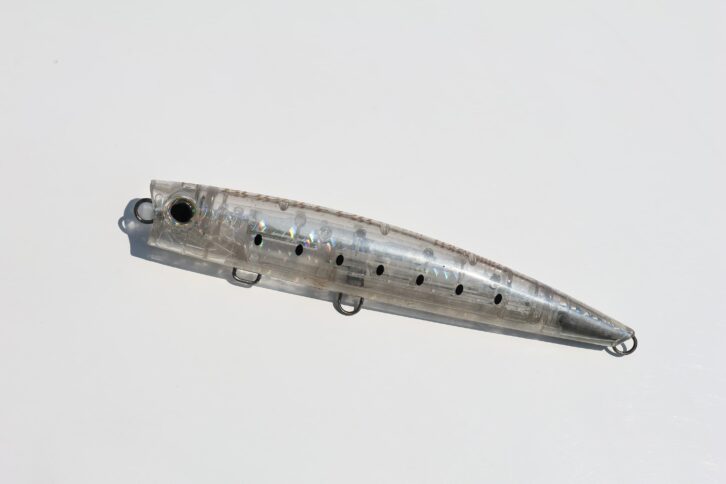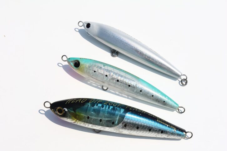 写真は、田代さんがよくセレクトするというトップウォーターペンシル。下から、ヘッドディップ200、オシアペンシル別注平政190F、フルスロットル190F。