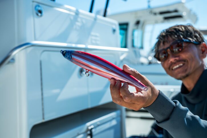 「一番は、その時にマグロが捕食しているサイズに合わせることですが、シラスや小型のイワシの場合、パワーのあるタックルを使用しているため、ルアーを合わせることはできません。タックルセレクトはまず、狙うマグロのサイズに合わせたロッド、リール、ラインとなり、そのタックルで投げられる、飛距離を出せるルアーをセレクトすることになります。そのため選ぶルアーは限定されますが、そのルアーに反応してくるマグロを探していきます。ちなみにタイプでは、自身のこれまでの経験やお客さんのヒットの様子を見る限り、ポッパーに好反応を示すことが多いように感じます。また、使用するタックルでキャストできるルアーのサイズに関しては、大きすぎるものよりワンサイズ小さい方が良いと感じています。30cmのサンマを捕食している状況では、30cmのルアーよりも25cmのルアーのほうが反応が良いことが多いです」