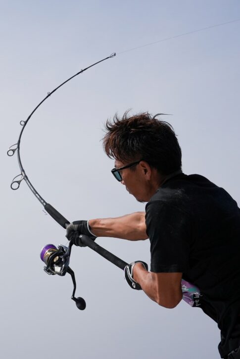 「ラインの角度が斜めであれば、ドラグを締めてプレッシャーを掛けつつ、相手の動きに合わせてポンピングで巻きます。ラインが垂直に下に入っている場合、ドラグを強く入れてしまうと、ロッドは下方向に大きく曲がり、体勢が前屈みになりキツくなってしまいます。船長と連携できれば、船を操作してラインが斜めになるようにしてもらいます。そうでなければ、ロッドを脇挟みに戻して、ストレートファイトの体勢にしてからドラグを締めて対応します。ドラグは相手に動きに合わせて徐々に締めるのがベストです。自分はファイト中、常にロッドを立てて相手によりプレッシャーを入れるように意識していますが、立てると体勢がキツい場合はストレートに持ち替えます。こうした動作を繰り返しながら、ラインを回収して距離を詰めます」