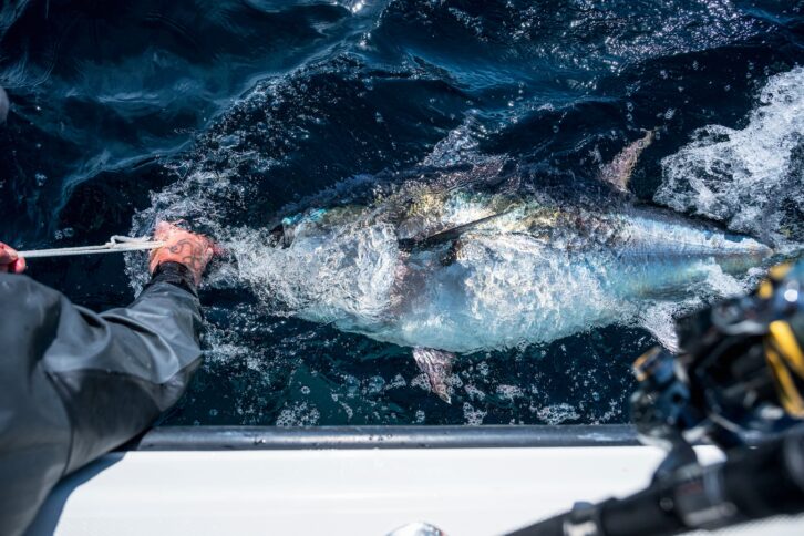 ちなみに、マグロはある程度疲れさせたほうがリリースがしやすいという。早く上がることもあるが、早すぎると元気で暴れるため注意したい。