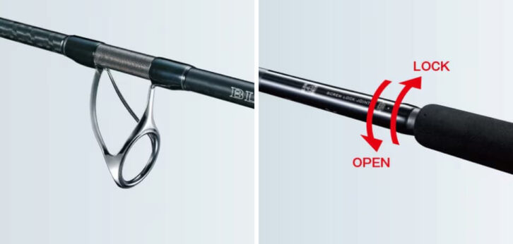 オシアプラッガー BGは、ライントラブル減少、放出抵抗の軽減、ラインのダメージを軽減するRVSGガイドをバット部に採用。グリップの脱着部は、ロック式になっておりトラブルの心配がない。