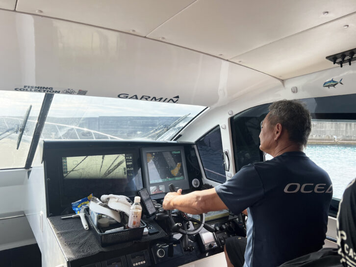 しかし前日とは打って変わって魚からの反応が全くない、静かな海へと変わっていました。そこで船長は早めに見切りをつけ、シャローエリアへの移動を決断。このシャローエリアでは、ワイルドレスポンス240Fをより目立たせ、広範囲にアピールするように、普段よりも強めのジャークで引きつつ、ショートジャークの動きで誘っていきました。しっかりと潮も流れており、良い雰囲気の中で、キャスト開始して数投で本命のGTからのバイト。しかし、これもフッキングまで持ち込めませんでした。