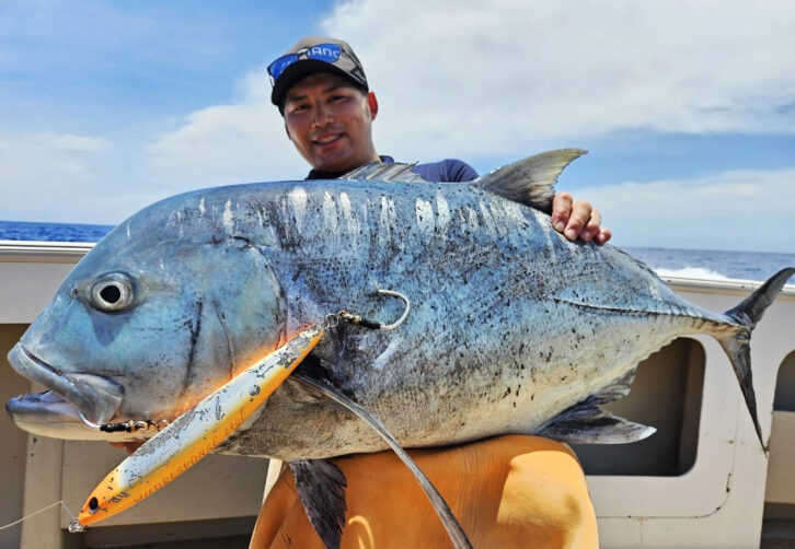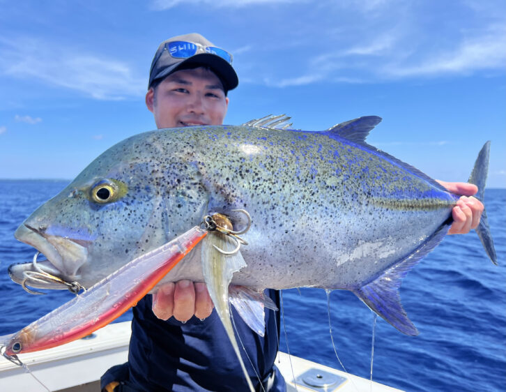 このルアーはオフショア用ではなく、ショアビッグゲーム用に開発されたシンキングミノーですが、深い層をサーチできることから使ってみることに。フルキャストしてから25カウントで沈め、そこからただ巻きで探っていきます。すると中層で“ゴッ”とバイト。一瞬、GTと思いましたが、寄せてくると綺麗な良型のカスミアジ。本命ではありませんが、南方らしい魚がようやく釣れ、ホッとすることができました。