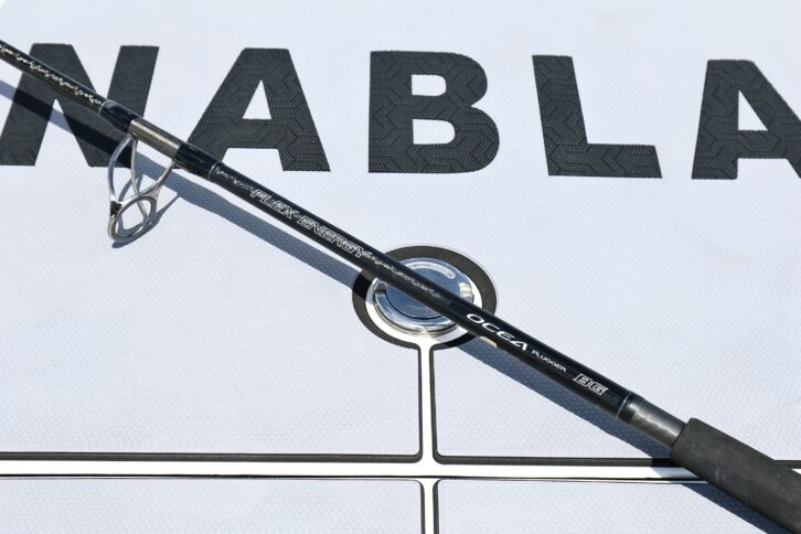 続けて、メインとなる大型マグロ対応のタックル。こちらはシマノ・オシアプラッガーBGシリーズの中のFLEX ENERGYのS710XHをセレクトしている。100〜200gのプラグを正確にキャストできるとともに、操作性も高いモデルだ。これを2本用意し、PE10号、12号を巻いたリールをセットする。リールは、STELLA SW18000HG。PE10号は、夢屋20 STELLA SW 20000MAXスプールまたはノーマルの20000番のスプールに巻いたものに、ナイロンリーダー180lbを結束。PE12号は、夢屋20ステラSW 20000MAXスプールにナイロンリーダー220lbを結束する。PEラインは、いずれも最強性能のオシア 17+PEだ。