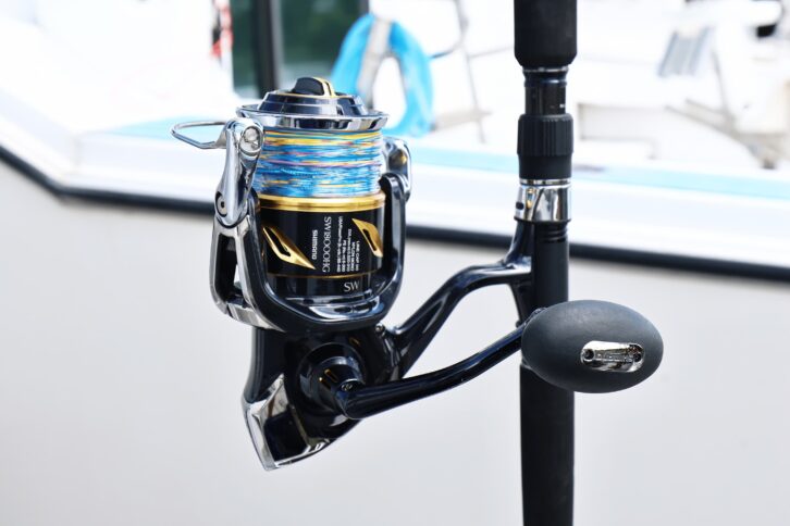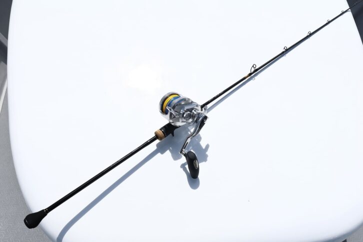 マグロの反応はあるが浮かない状況に対応するために、ジギングロッドも1タックル持参するという。ジグをシャクリ上げ、フォールで捕食させるために、スロージギングロッド・オシアジガー ∞を使用。リールは糸巻量がありシャクリ続けられるオシアジガー4000をチョイス。使用ラインはPE8号+フロロカーボンリーダー100lb、30号。