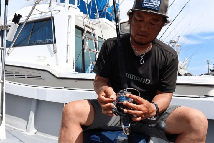 「自分の場合、初期ドラグは毎回しっかりと器具を使って計測しているわけではなく、スプールを手で持って回し、感覚的に覚えている負荷に調整します。もちろん最初は測定して感覚的にドラグ値を知ることが大切です。そして、マグロの捕食の仕方によって臨機応変にドラグ値を変えることもあります。マグロが激しくベイトを喰っていて、捕食と同時に勢いよく走りそうな時などは、初期ドラグは緩めにしておき、喰ってから徐々に締めていきます。大まかな目安として、自分が一般の方に伝えているのは、初期設定は新品のラインであれば号数の数字と同じキロ数に合わすということ。10号なら10kg、12号なら12kgです。そこからヒットと同時に徐々に締めて、プレッシャーを掛けていきます。自分は相手の動きに合わせて、感覚的に操作していく感じです」