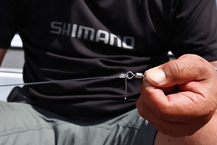 また、ルアーとの接続部分は、スイベルとスプリットリングが基本。スイベルへのリーダーの接続は、スリーブを使うこともあるが、ほとんどはスイベルに直接リーダーを「シングルクリンチノット」で接続している。こちらもシンプルな結びだ。結び方は、下記の手順を参考にしてほしい。また、結べない人はスリーブ止めでもOKだと言う。