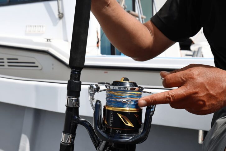 鈴木さんは、竿先からリーダーを出し、ルアーを垂らしたキャストポジションの状態で、リーダーの結び目がスプールに入る長さにしているという。キャスト時に人差し指はリーダーに掛けることとなる。