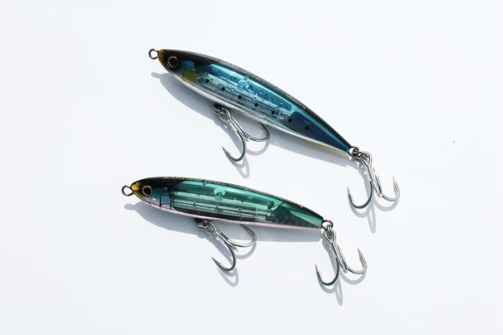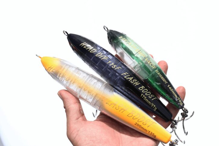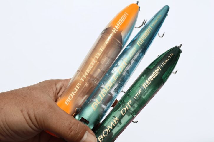 ボムスロットル200F、バブルディップ220F、ボムディップ170F。ボムスロットル200Fは、泡を出しながら水面で首を振るようなアクションが特徴。バブルディップ220Fはスプラッシュで気づかせ、ダイビングで捕食本能を刺激するモデル。ボムディップ170Fは、少ない移動距離で泡と大きなポッピング音を発生して強くアピールするモデル。どれもマグロに効果的なモデルだ。