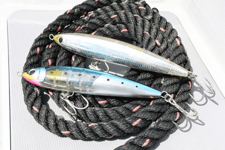 ワイルドレスポンス240F、別注平政220F フラッシュブースト。シイラなど大型ベイトフィッシュに対応する大型ルアーだが、マッチザベイトだけでなく、大きさによるアピールが強いことで威力を発揮することも多い。もちろん飛距離も出しやすい。鈴木さんもクロマグロを獲った高実績モデルだ。