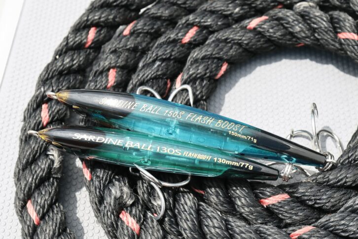 「小さいベイトを喰っていて小型のルアーを選ぶのにも限界があるので、自分が選ぶ小さめのルアーはフローティングなら14cmほどです。相手が特大サイズでなければ、PE8号で勝負することもあります。またシイラベイトの場合は、240mmなどの大き目のルアーをセレクトします。飛距離も出ますし、アピールも高いからです。ただクロマグロに関しては、他の釣りのようにルアーサイズを厳密に合わせることはそれほど気にしていません。フローティングとシンキングの使い分けはします。イワシ団子があっても上までマグロが出ずに、下でベイトを喰っている時があります。そんな時はシンキングで沈めると一発で喰うことも多い。そのためシンキングも何本かは持参します。シマノ・オシア サーディンボール150S(71g)、130S(77g)ですが、8号、10号なら扱うことができます」