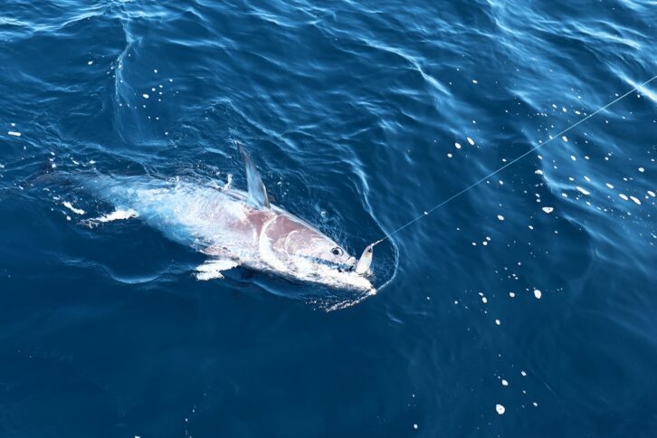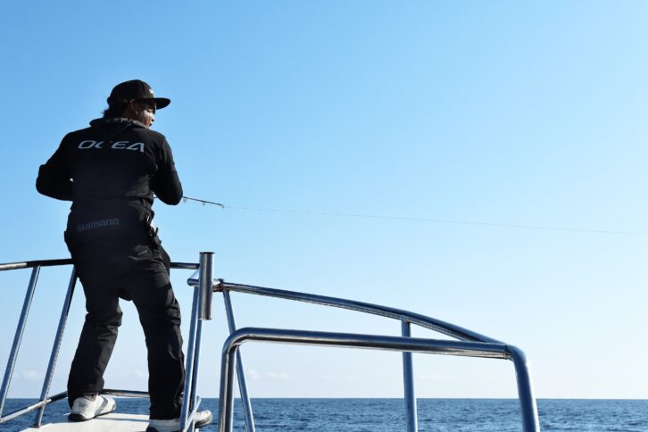 ちなみにマグロが船の真下に入った状態での長時間ファイトは、釣り人にとって非常に厳しい。そのような場合は、船長に少し船をバックしてもらうように伝え、ラインを斜めにしてもらうこともあるという。そして、マグロが見える位置まで寄せたら、ロッドをストレートに構え最後の勝負となる。