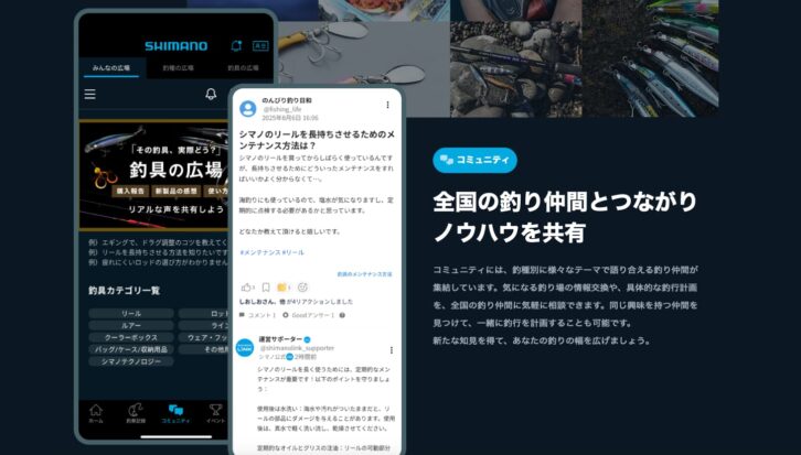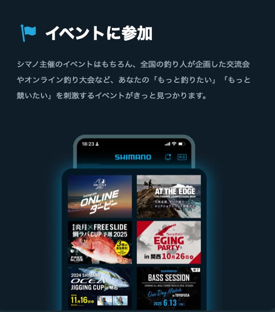 またスマート釣果記録では、写真とともに位置情報を記録。釣れた魚の種類、サイズ、釣り場、使用したルアーなどの情報をまとめて保存することが可能だ。さらに、アプリ内でシマノ主催のイベントや、全国の釣り人が企画した交流会の情報も得られるため、参加することでさまざまな釣り人と交流でき、より充実したフィッシングライフにつながるはずだ。