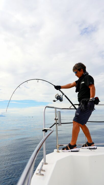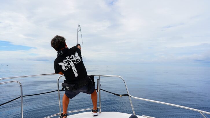 船下にマグロが回り込む時は、船底でラインが擦れないよう脇挟みで誘導する。マグロが浮いたらキャッチとなるが、リリース、キャッチともに船長がいる位置へマグロを誘導して終了となる。