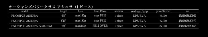 またOCEAN‘S Power Class ASHURAは、ティップからグリップまでワンピースで設計され、リフトパワーとキャスト性能を追求したシリーズ。アメリカ遠征でモンスタークラスとテストを繰り返し、完成させたモデルとなる。こちらはPE12号に対応する65、70の2種類と、PE12号OVER対応の70のdeath roadモデルを展開している。