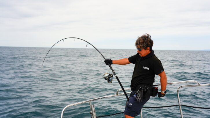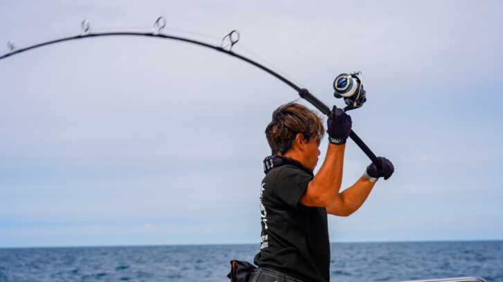 横に掛かっている場合は、あまり無理をすることができず、魚の圧力でなかなか浮いてこないため、魚の泳ぎを利用しながら巻き上げてきます。船の真下に入ってきた時は脇挟みで耐え、船から離れてこちらに向かってくる時に、ロッドを立てて距離を詰めていきます」