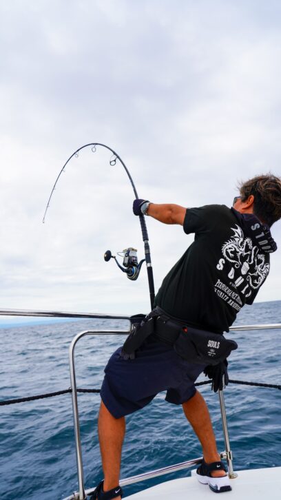 「SOULSロッドで常に目指しているのは、リフトパワーが強いということ。どのメーカーよりも破断テストを繰り返していると思っています。そして他のメーカーの破断強度より、2ランクほど上に設定しています。さらに粘り強く、楽にファイトできることを追求しています。SOULSのロッドは、立てられるのは当たり前。もちろん状況によってストレートファイトも必要になりますが、基本はロッドを立てたファイトで、マグロにプレッシャーをしっかりと掛け、かっこよく釣り上げたいと思っています。またロッドの弾力を使うことで、マグロとのやりとりをより楽しめるとともに、糸への負担、リールへの負担も少なくなります」