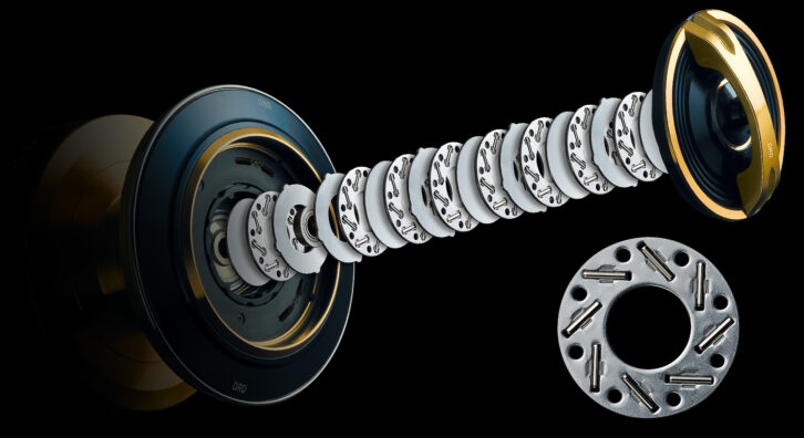 従来のカーボンワッシャーは、金属ワッシャーとの接地面の摩擦力によりドラグを効かせていた。そのため、高ドラグ値での激しいライン放出では、高熱によるドラグ力の低下、摩耗、固着などが起こる可能性があった。しかし、DRDはすべて摩擦劣化が起こりにくい金属プレートであり、ワッシャーに取り付けられている金属ローラーの傾斜による回転と摩擦でドラグを効かせていることで、耐久性が高いのだ。