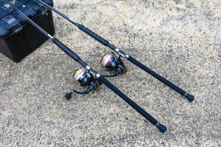 インタビュー取材の後に実釣取材の予定が入っていた佐藤さんが用意していたメインタックル。この時は、OCEAN‘S Power Class LEVEL SERIESの076L14SとOCEAN‘S Power Class ASHURAの070PCS death roadモデルを用意。リールはともにSALTIGA25000、ラインはPE12号。