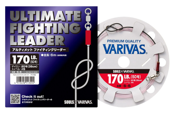 アルティメット ファイティングリーダーは、ザイロンノットの長さの違いでラインナップされている。INVITED MODEL(5cm)は、ルアーの操作性に優れた誘い出し専用のショートモデル。MULTI MODEL(10cm)は、ナブラ撃ち、誘い出しの両方に対応するミドル設計。SHOOTING MODEL(35〜45cm)は、ナブラ撃ち専用で、丸呑みやスレ掛かりの状態でも安心なロングザイロンモデルだ。先端には強靭でガイドに通しやすいSOULS社のBBスイベルが装着されている。リーダーの強度は105lbから220lbまでをラインナップ。