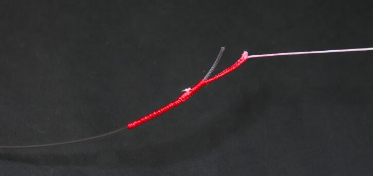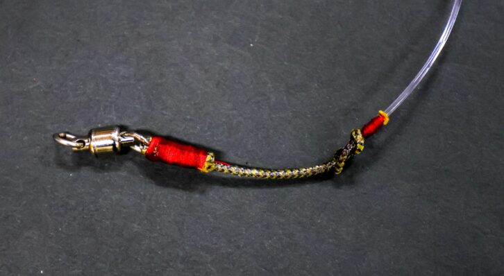 そして、この完璧な結束の結果、佐藤さんはリーダーとリングの結束部の強度に着目した。そこでこの部分も100%に近い結束を目指して研究して生まれたのが、ザイロンをリーダーに被せてBBスイベルにスレッドで巻き止める方法だ。それを、誰でも使えるようにしたものが「アルティメット ファイティングリーダー」として発売されている。