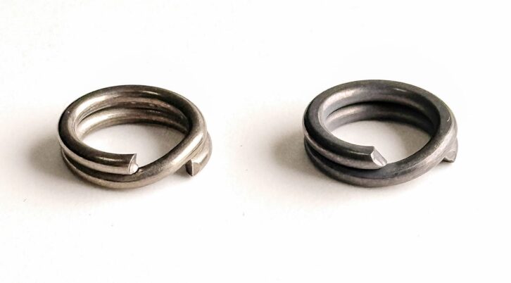 左が一般的なスプリットリング、右がカツイチ社・デコイのスプリットリングにフッ素コート加工を施したSOULSのチューン・スプリットリング。切断面が斜めにカットされていることが分かる。斜めにカットされていることで、切断面でルアーのワイヤーがロックされずにズレるため、リングが開かない。