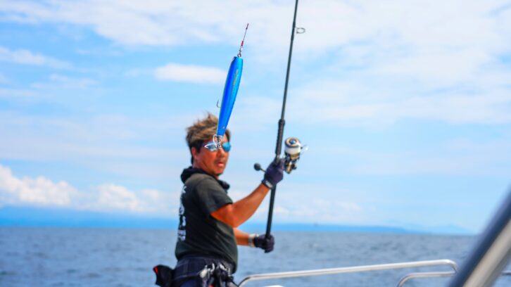 「ナブラがあれば、その横にルアーを投入します。ナブラのど真ん中に入れるとラインブレイクになる可能性があるので注意が必要です。シイラナブラでは、次にマグロが出る場所を読んで投げ入れます。サバに出ている時も、マグロがどちらに向いているかを読んで、その進行方向の先に投げ入れます」