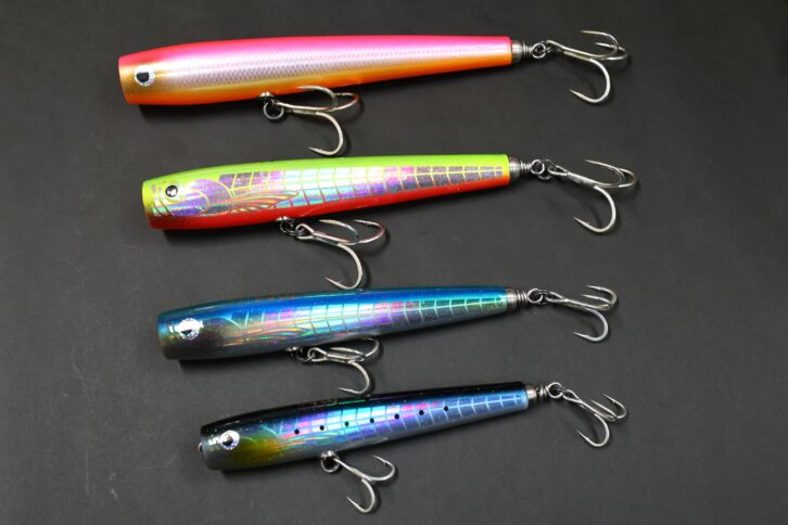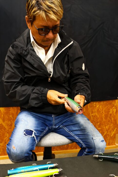 他のメーカーはペンシル系を出してきましたが、他とは違うものを出したいという思いがあり、モグラッパー、モグラッパースリム、ダイナマイトドンドン、鮪山と音と泳ぎでアピールするカップを備えたルアーを展開してきました。しかし最近では、他社からも同様のポッパー系が増えてきた。そこで初心に立ち返り、現在はペンシル系を開発しています。見た目は普通のペンシルですが、使い方が少し違う。これまでにないフローティングペンシルです。実績はかなり出ていますので、発売までもう少しお待ちください」