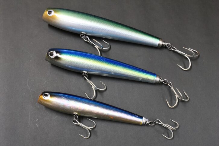 まず『モグラッパー』は190mmを最初に出しました。ただ一般的に好まれるのは、『モグラッパースリム』の230mmです。これはどちらも同じ150gです。自分のクロマグロ釣りは、まず掛けることを前提に考え、その後、しっかり獲れるかどうかを考えます。そして、シルエットが短く太いモグラッパーのほうが、獲れる確率が高いと言えます。なぜなら短く太ければ、前後両方のフックが口内に掛かる可能性があるからです。モグラッパースリムでは、どちらか一方のフックが掛かる、もしくは遊んでいるフックが外側に掛かる可能性もあります。片方のフックだけでは外れる可能性があり、外側に掛かると、どうしてもファイトに時間が掛かり、フックアウトのリスクが高まります。ただし、操作時の引き抵抗は軽く、扱いやすいため人気です。また、モグラッパーよりも、さらにアピール力を強くしたのが『ダイナマイトドンドン』です。そしてダイナマイトドンドンに対して、全長が長く、飛行姿勢が良く、連続ジャークがしやすいことから、多くのアングラーに好まれているシルエットが『鮪山(シビヤマ)』です。ちなみに、シイラパターンであれば、実績のある『コムソー』を選ぶことが多いです」