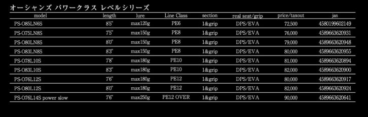 OCEAN‘S Power Class LEVEL SERIESとOCEAN‘S Power Class ASHURAは、パワークラスごとに長さ違いで展開されている。ロッドの特性上、長ければ飛距離が出せ、短ければファイトがより楽に行える。どの長さを選ぶかは、アングラーの好みによるだろう。
